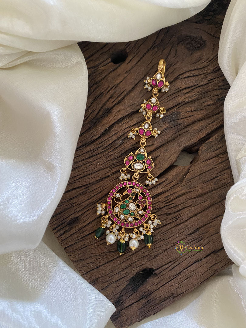 Heritage One Stand Redish Pink Peacock with Redish Pink and Green Kili Kundan Jadau Sisphool with Mini Pearls and Beads -. The fusion of these majestic birds symbolizes grace, beauty, and auspiciousness, making it a perfect adornment for special occasions. Embellished with shimmering gemstones or pearls, this exquisite accessory adds a touch of sophistication to the wearer's ensemble. Worn delicately at the hairline, it captures the essence of timeless grace and is sure to captivate hearts with its radiant allure.