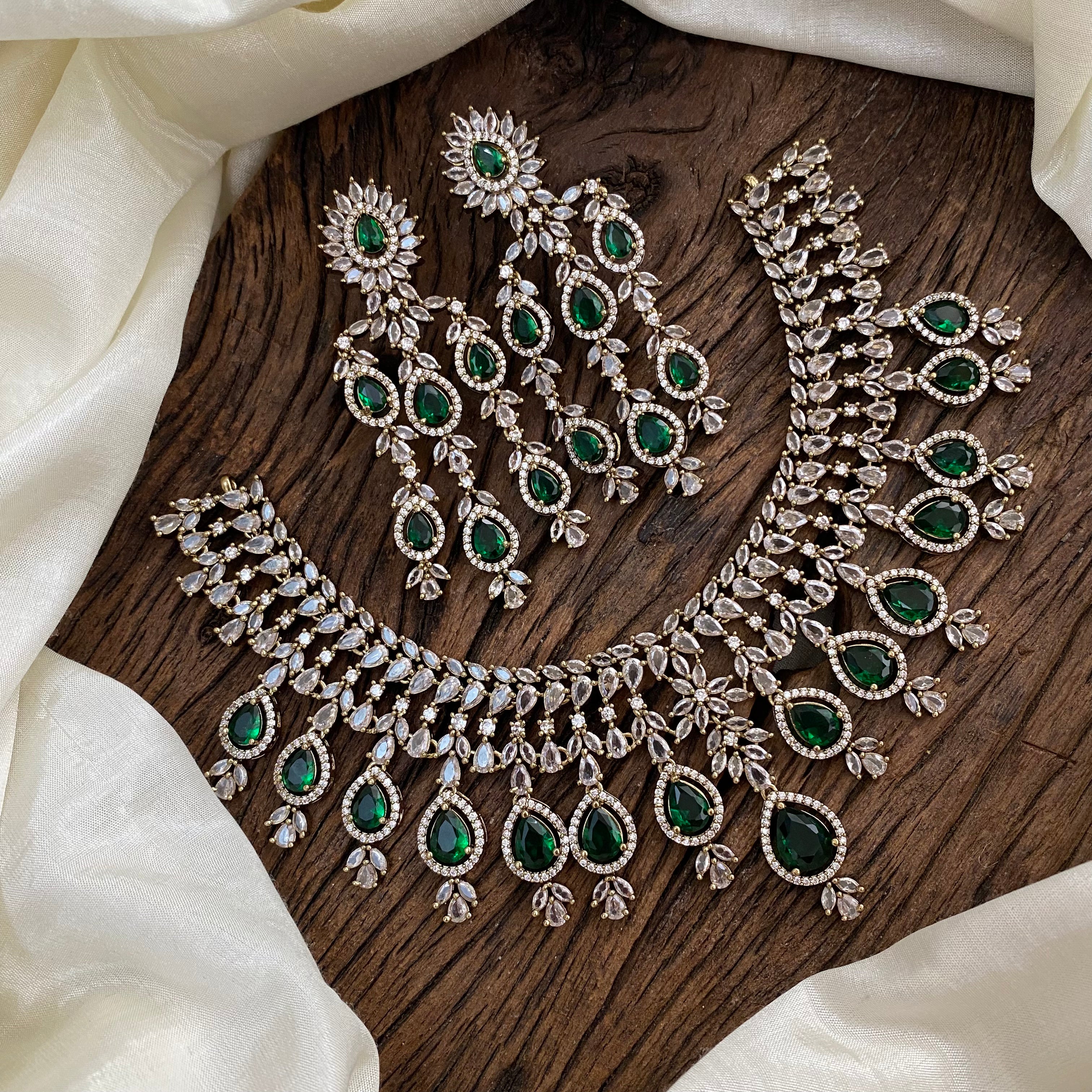 Graceful Bridal Victorian Diamond High Neck Choker Green - Adorned with exquisite green and white diamonds and intricate detailing, our bridal jewelry is a tribute to the grace and sophistication of bygone times. From ornate necklaces to delicate earrings and enchanting tiaras, every piece is crafted to perfection, making it the perfect accompaniment to your special day. Elevate your bridal ensemble with our Victorian diamond jewelry ; comes with pair of matching earring.