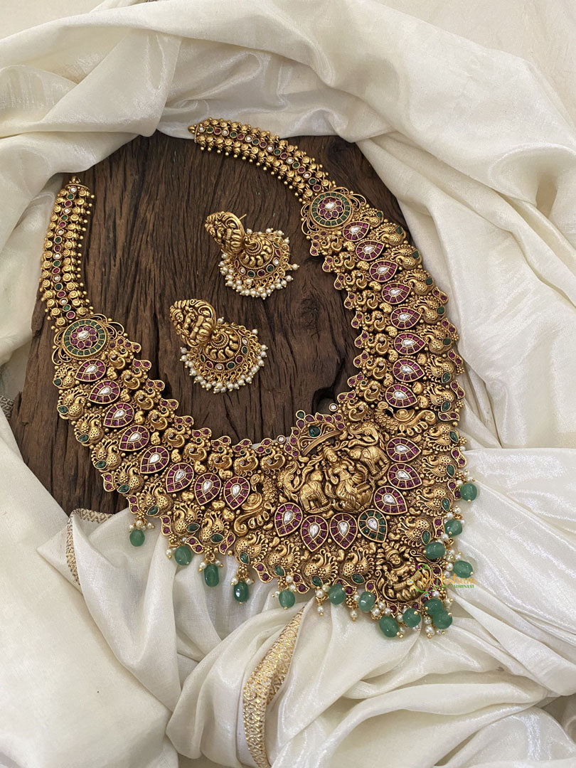 Experience the beauty and elegance of our Layered Gold Look Alike Temple Haram, featuring an intricately designed temple neckpiece adorned with stunning stones and a unique Maanga Lakshmi Haram in red and green. Complete the look with our matching earrings, elevating any outfit with a touch of regal sophistication.