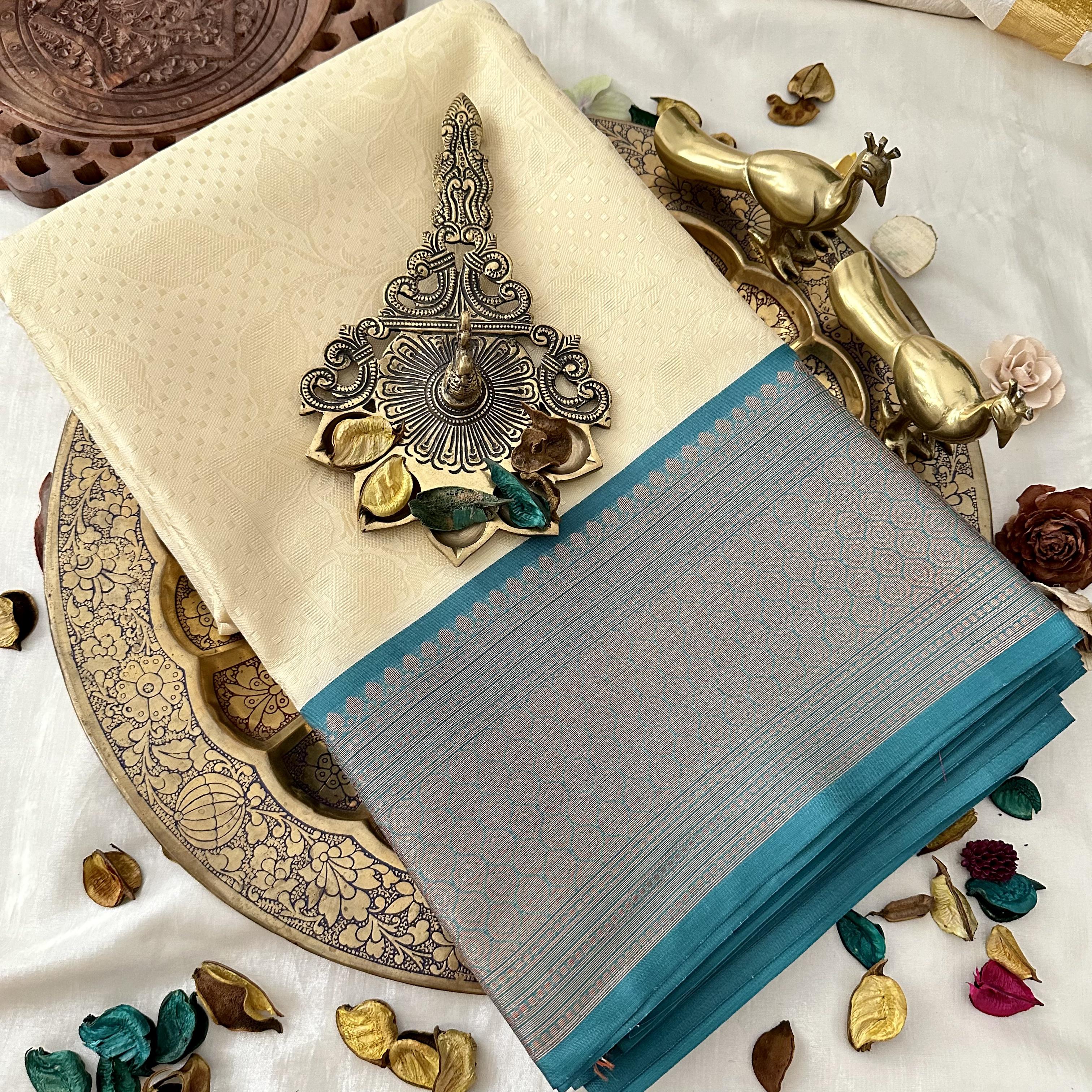 Cream Color Kora Muslin Saree with Dark Green Border – Festive wear Kora Muslin saree manufactured in Varanasi –designer printed throughout the saree ; comes with Blouse attached.