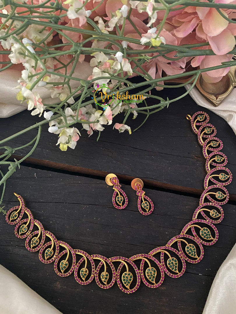 Red Green CZ Stone Choker Neckpiece - spiral shaped with leaves in it , comes with matching danglers.