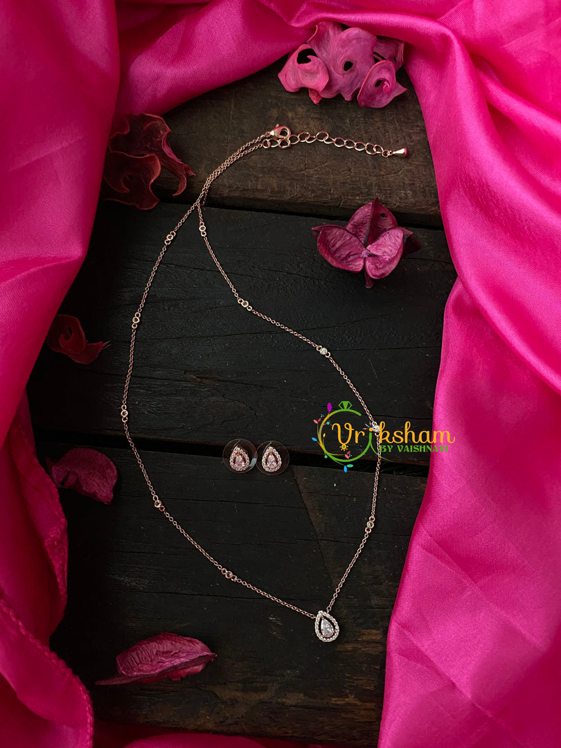 Designer Daily Wear AD Stone Pendant Chain Neckpiece-ROSE GOLD TONE - western neckpiece Pear Shape Pendant -single pendant chain; Comes with matching studs.