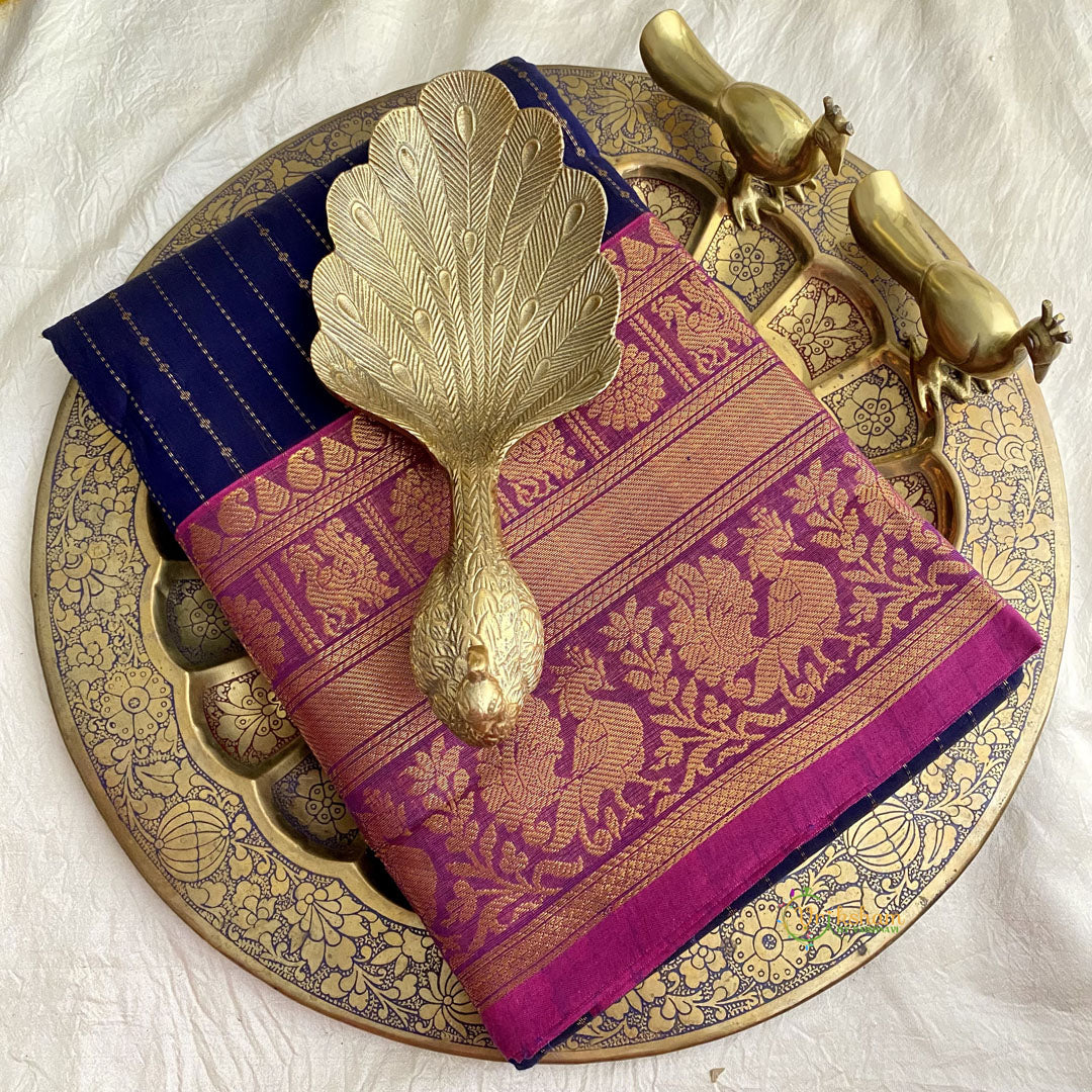 Dark Blue Kanchi Cotton Saree with Double Golden Border - Handloom - VS3686