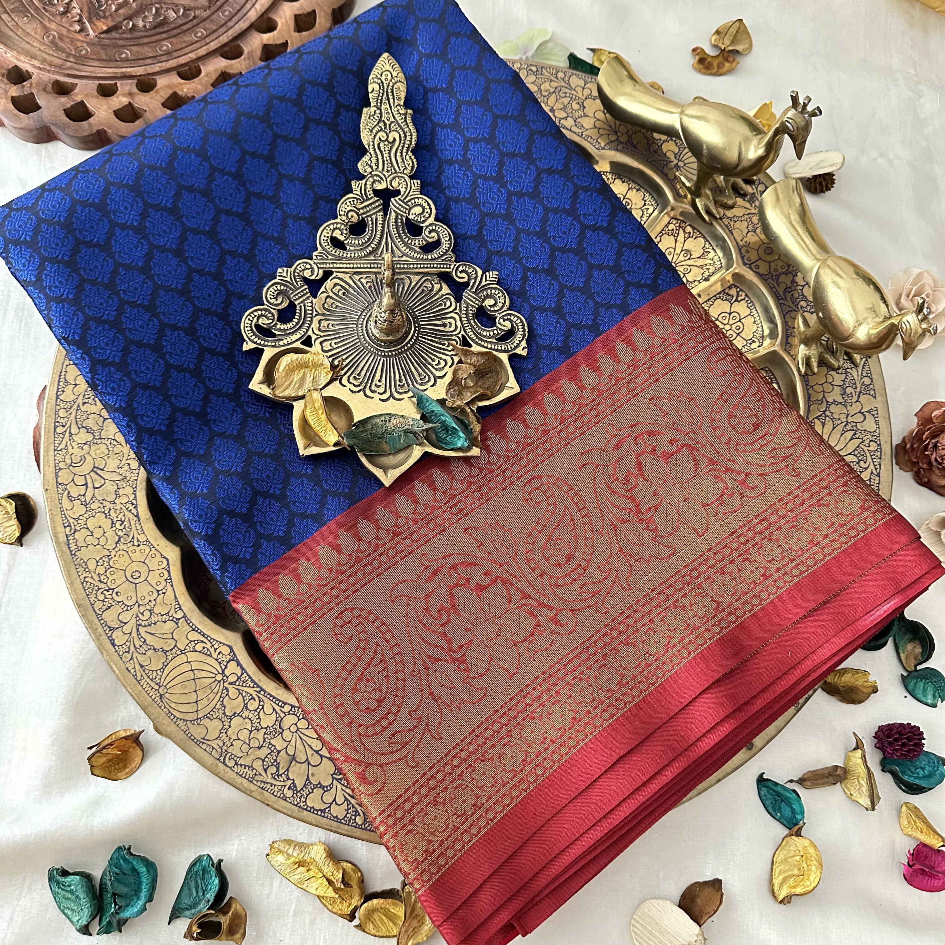 Dark Blue Kora Muslin Saree with Red Border – Festive wear Kora Muslin saree manufactured in Varanasi –designer printed throughout the saree ; comes with Blouse attached.