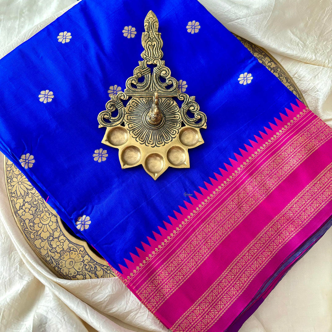 This stunning dark blue saree is sure to make a statement with its magenta pink border and intricate double golden thread work with butta all over saree. Made from luxurious paithani semi silk, this saree is perfect for any occasion, giving you a touch of elegance and style.