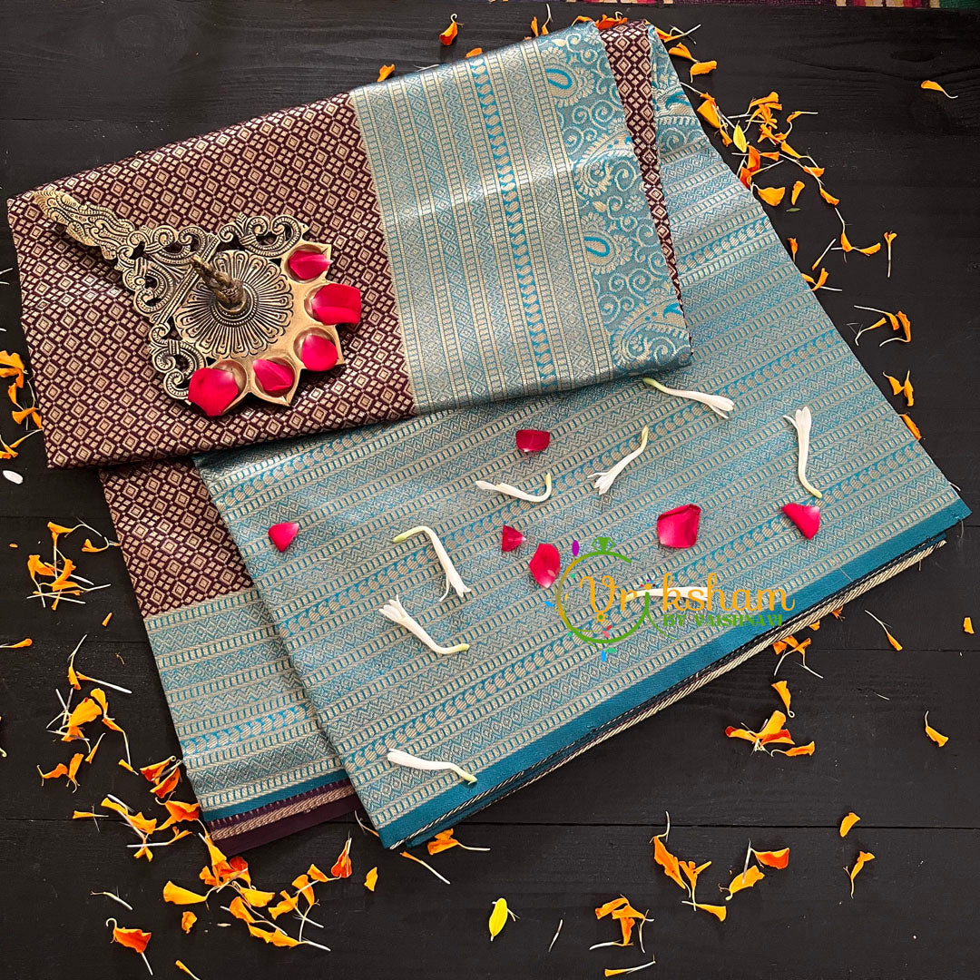 Dark Brown with Blue Border Silk Saree- Litchi Silk Saree - Festive wear saree – Smaller dice with dot pattern throughout the saree; comes with Blouse attached. One side Big Border and other side lean border. Power loomed saree.