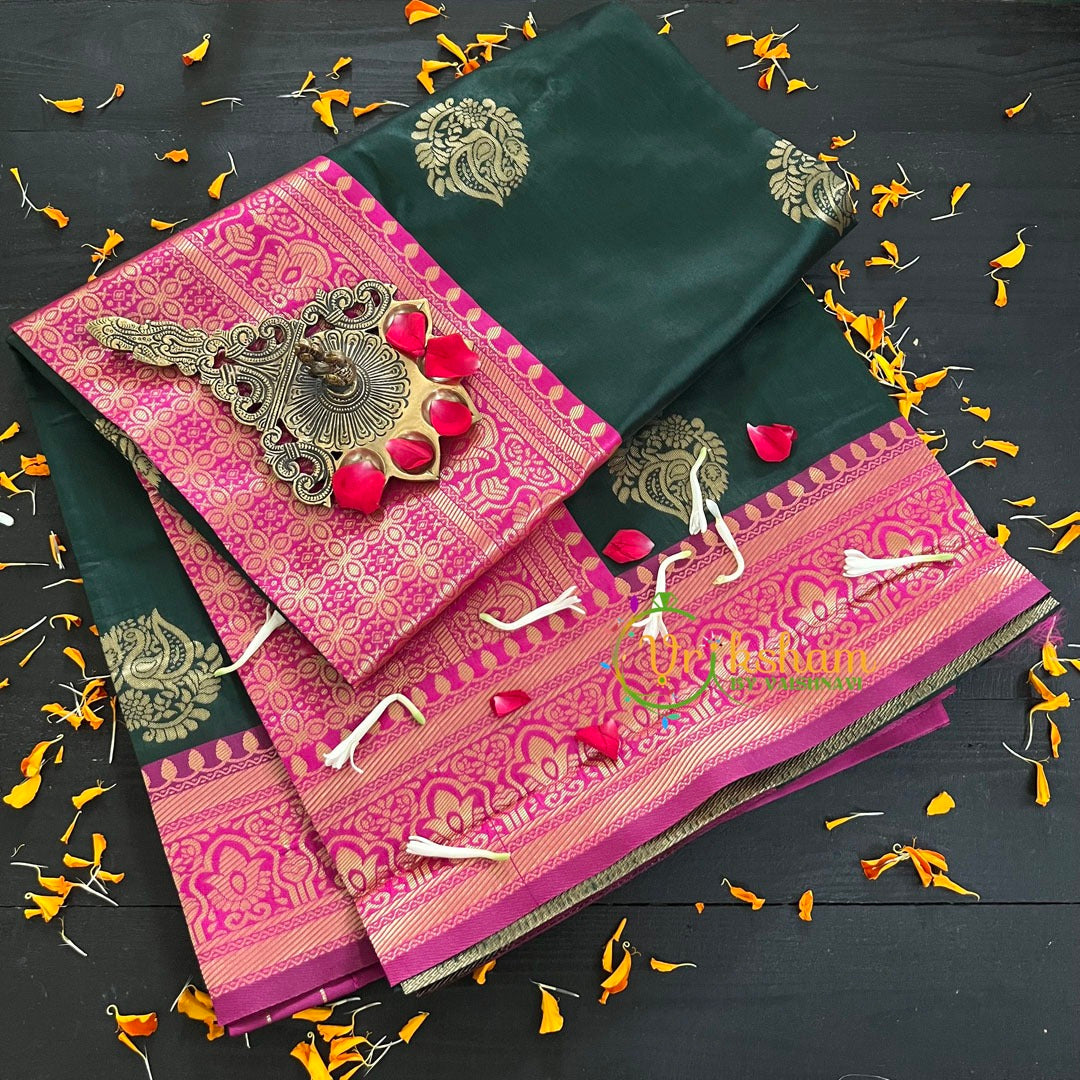 Dark Green Saree with Pink Border- Litchi Silk Saree - Festive wear saree – Motif pattern throughout the saree; comes with Blouse attached. One side Big Border and other side lean border. Power loomed saree.