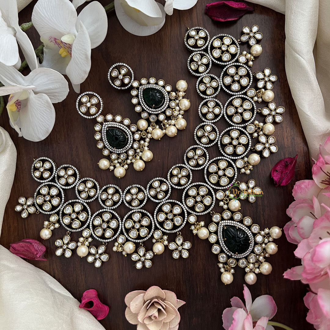 Dark Green Stone Victorian Diamond High Neck Choker short neckpiece - precious green stone studded and pearl finish royal jewelry; comes with matching earrings.