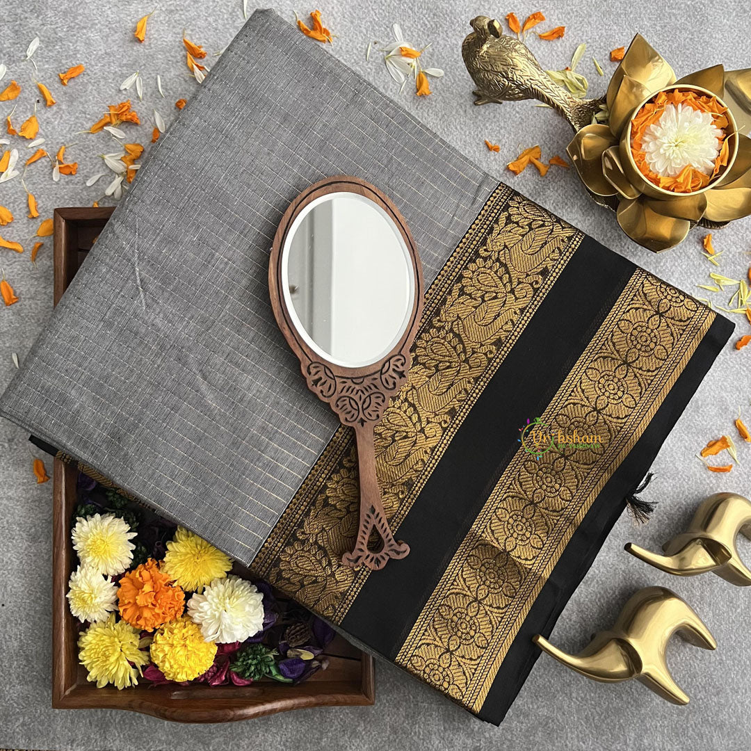 Dark Grey Kanchi Cotton Saree with Double Golden Border - Handloom - Drape elegance - Introducing our Dark Grey Kanchi Cotton Saree, a testament to understated elegance and comfort. Its soft cotton fabric ensures a comfortable drape, making it ideal for all-day wear. Adding a touch of sophistication, the double golden border frames the saree, elevating its charm with a subtle hint of opulence. Perfect for casual as well as for special occasion.