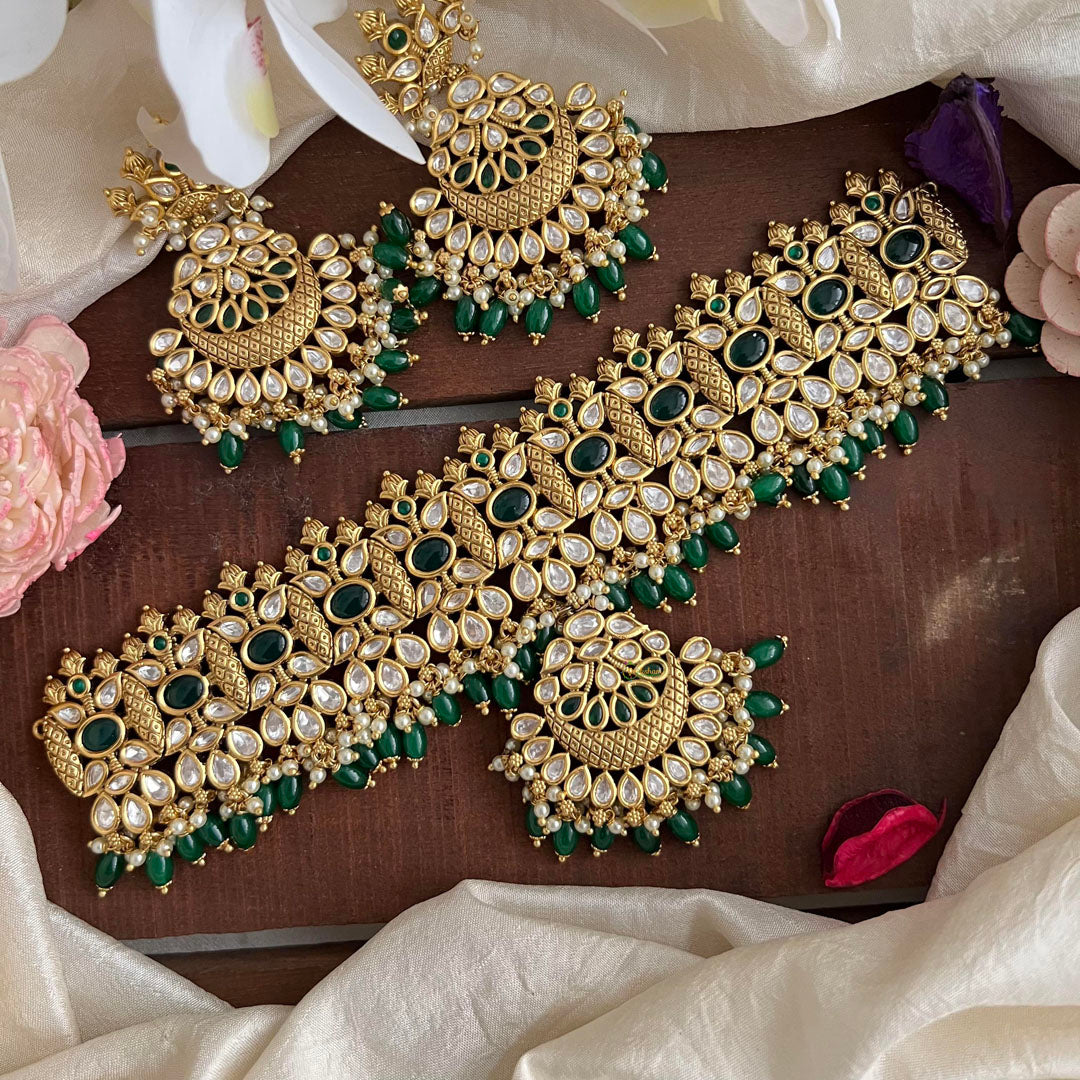 This exquisite choker features dazzling AD stones and a high neck design, adorned with beautiful green beads. Elevate your style with this designer piece, perfect for adding a touch of luxury to any look. A must-have for any fashion-forward individual.
