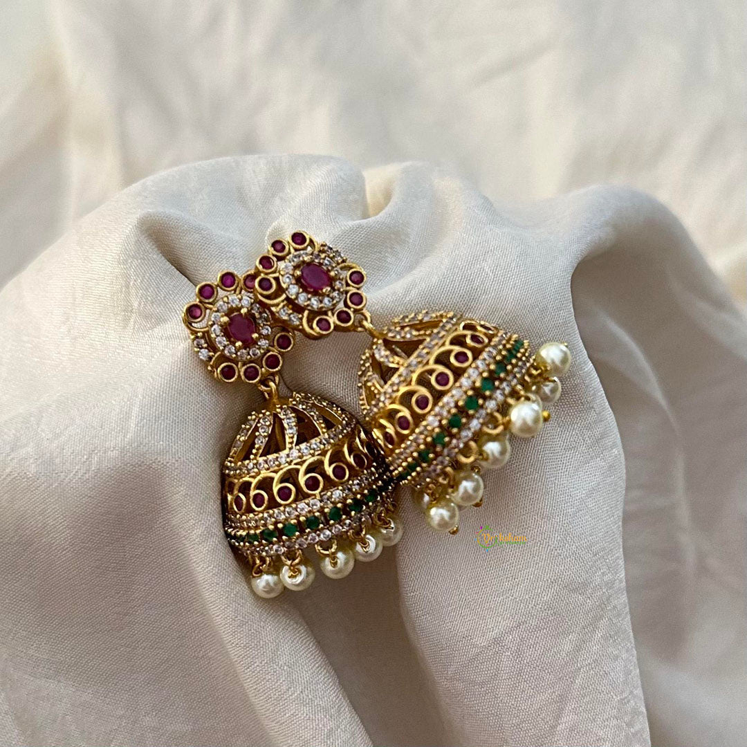 Elevate your style with our beautiful Designer AD Stone Jhumkas-Pearls! These earrings feature a stunning combination of white, red, and green AD stones, creating a vibrant and elegant look. The addition of pearls adds a touch of sophistication, perfect for any occasion. Upgrade your jewelry collection with these designer jhumkas that will surely make you stand out from the crowd.