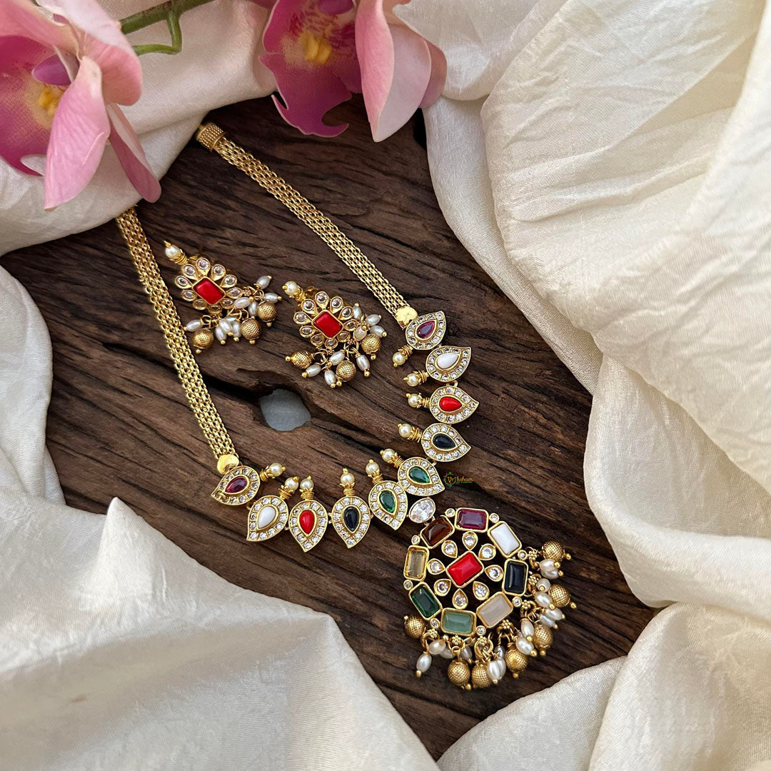 Add a touch of elegance to your traditional attire with this Designer AD Stone Navrathna Pendant Addigai. Featuring intricate golden detailing and a combination of colorful stones, this pendant exudes sophistication. Adorned with Rice Pearls and golden pearls, it is the perfect addition to your jewelry collection. Comes with matching earrings.