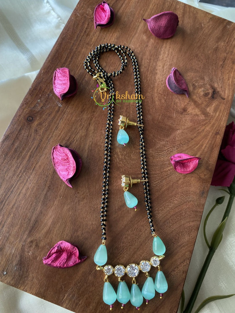 Designer AD Stone Pendant Mangalsutra Chain -Mangalsutra Style Pendant and Chain Neckpiece – 5 white ad stone with sea blue bead finish, Gold Look alike polish.