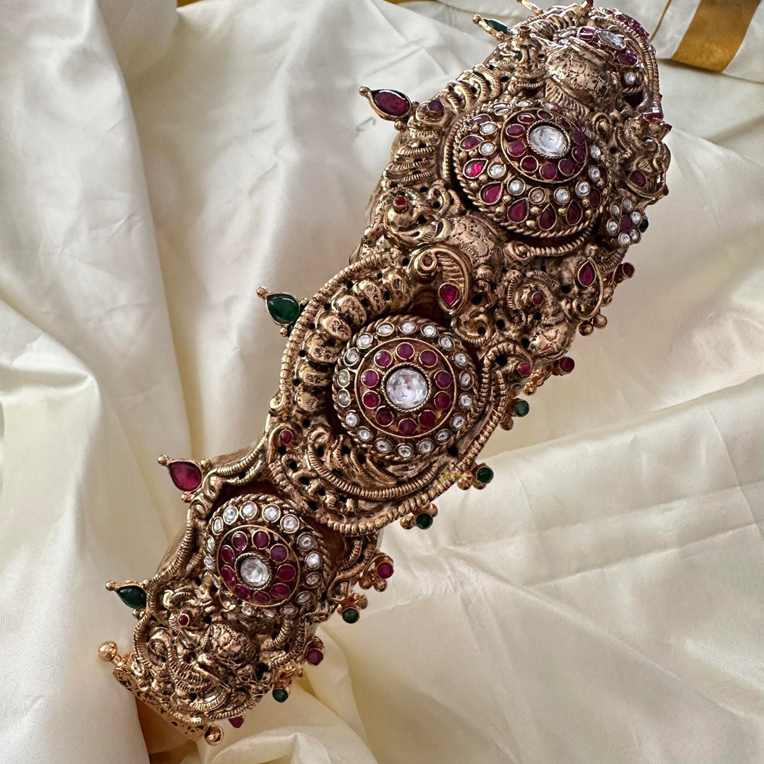 Elevate your bridal ensemble with our Designer Bridal 1 gm Gold Peacock Hip Chain. Featuring intricate peacock detailing and adorned with dazzling stones, this hipbelt adds a touch of sophistication and luxury to your look. Made with 1 gm gold, it's a unique and exclusive piece perfect for your special day.