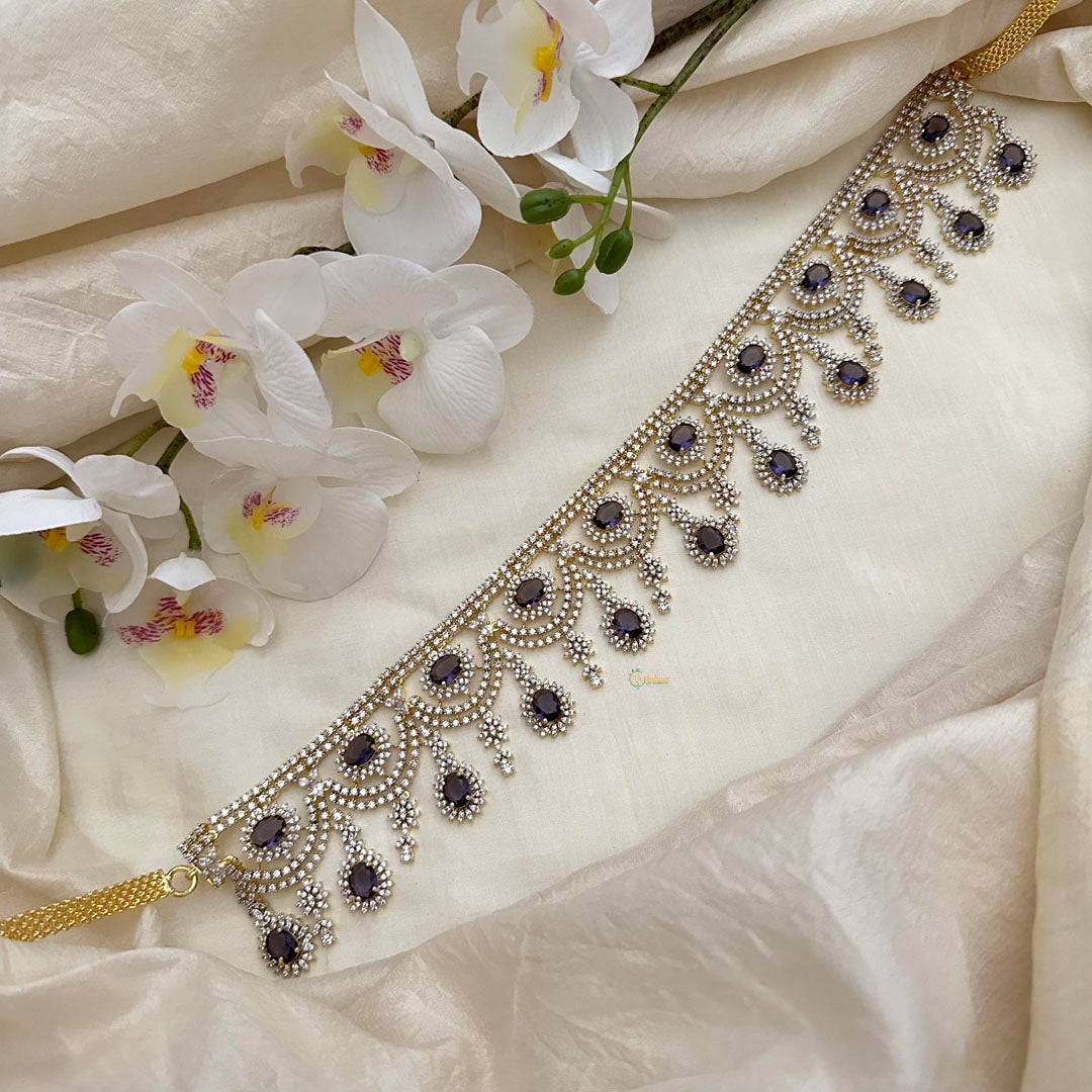 Enhance your bridal look with our Premium Bridal American Diamond Hip Chain. Exude sophistication with the Ganga jamuna American diamond design and luxurious red color. Elevate your style and make a statement on your special day.