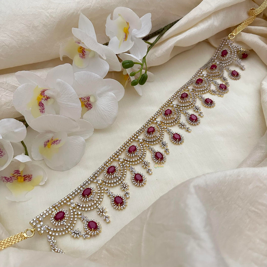 Enhance your bridal look with our Premium Bridal American Diamond Hip Chain. Exude sophistication with the Ganga jamuna American diamond design and luxurious red color. Elevate your style and make a statement on your special day.