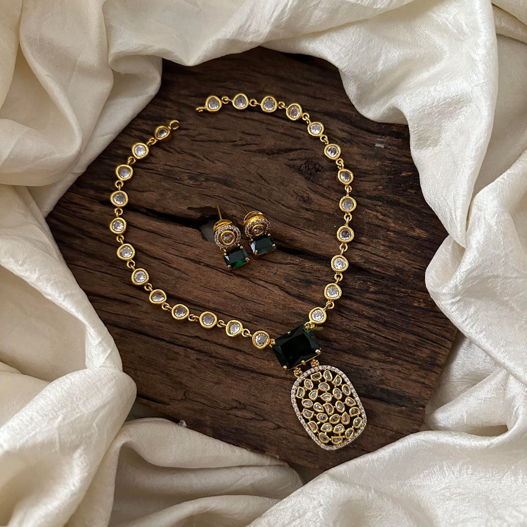 Upgrade your style with our Designer Emerald Green AD Stone Pendant Neckpiece -Geometric. This eye-catching piece is expertly crafted with vibrant emerald green AD stones and a unique geometric design. Elevate any outfit and feel confident with this statement necklace. Perfect for any occasion, from casual to formal. Comes with matching earrings.