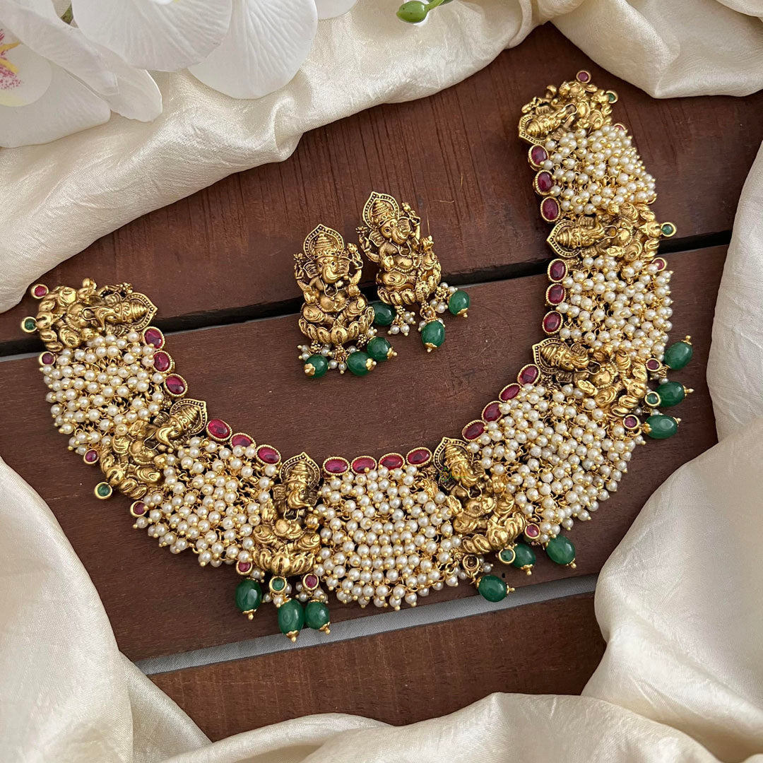 Indulge in luxury with our Designer Ganesha Neckpiece. Featuring a beautiful cluster of pearls and green beads, this exquisite neckpiece is adorned with a stunning Ganesha pendant. Elevate your style with this elegant and exclusive piece, perfect for any occasion.