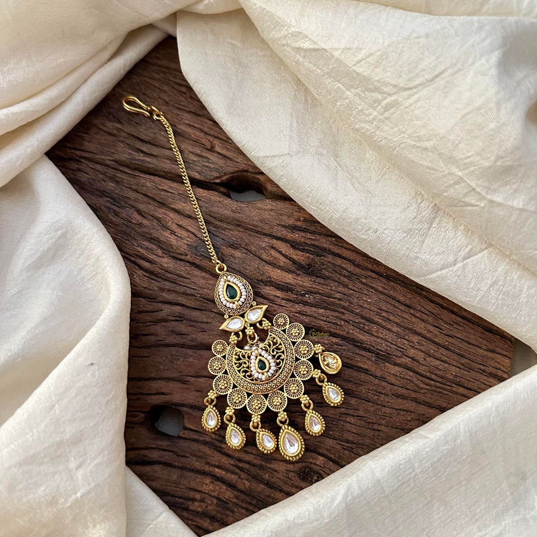 Elevate your traditional look with our Designer Green AD Stone Maang Tikka. The stunning tear drop pearl adds a touch of elegance and sophistication. Perfect for special occasions, this handcrafted piece is a must-have for every fashion-forward woman.