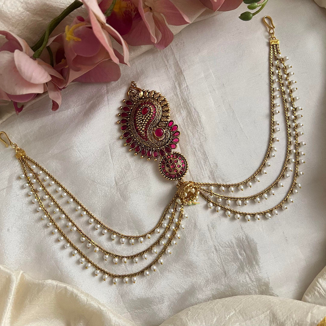 Add a touch of elegance to your look with our Designer Jada Billai embellished with precious red kemp and a delicate pearl Maatil-Bun Billai. The perfect accessory to elevate any outfit and make a statement. This exclusive piece is a must-have for those who appreciate luxury and sophistication.