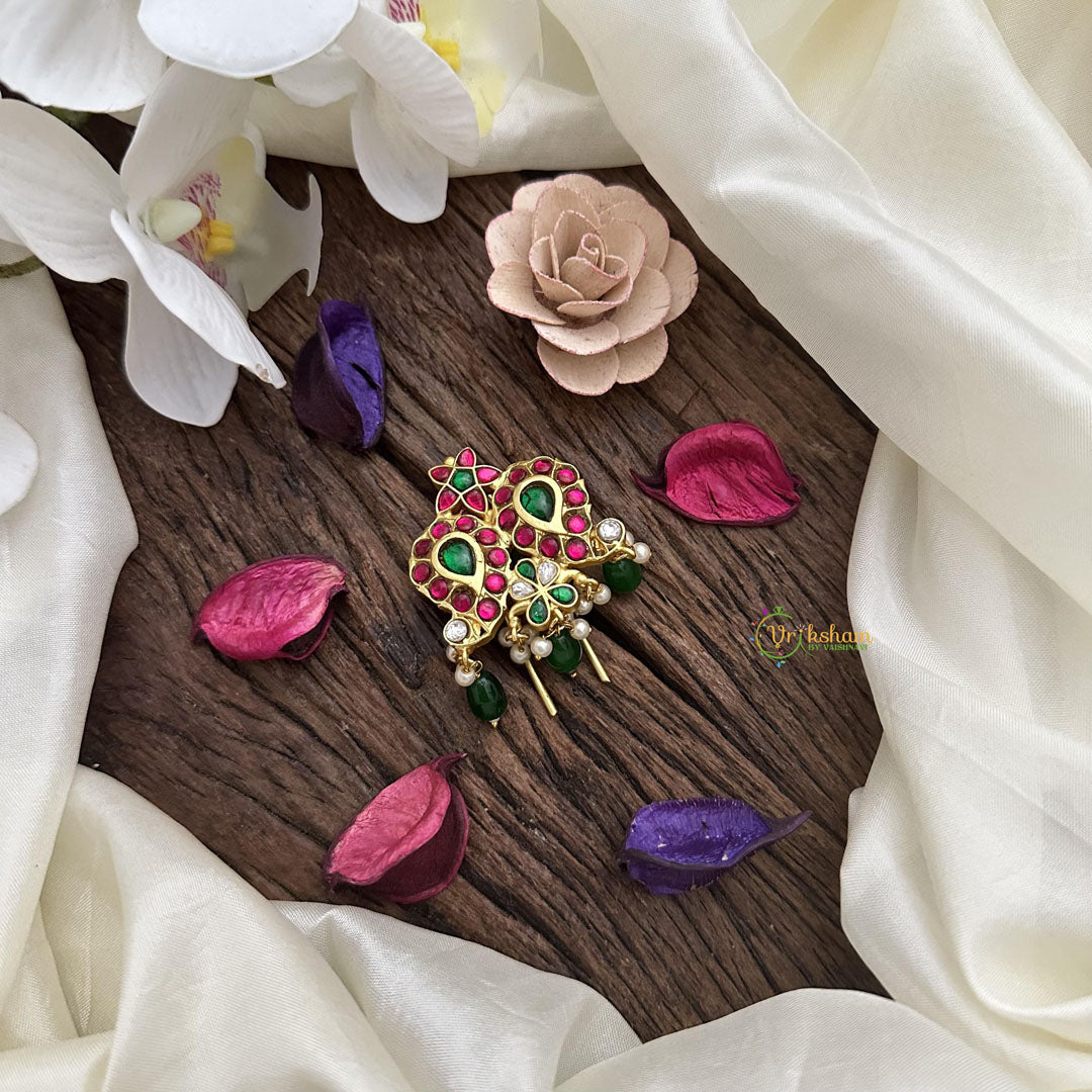 Elevate your hairstyle with our Designer Jadau Juda Pin, crafted with delicate green beads. Perfect for special occasions, the intricately designed pin adds a touch of elegance to your look. Make a statement and stand out from the crowd with this exclusive piece.