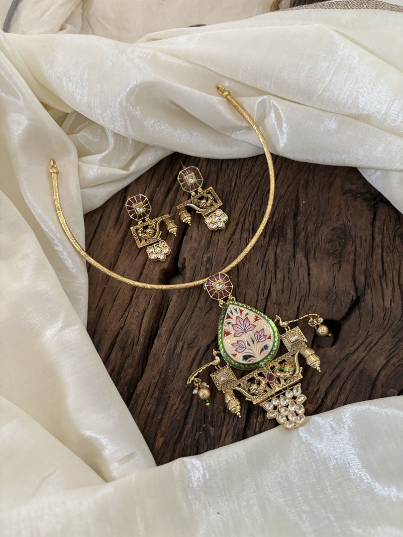 Designer Jadau Kundan Hasli Choker with Pendant -Green red Meenakari Pendant- J1845