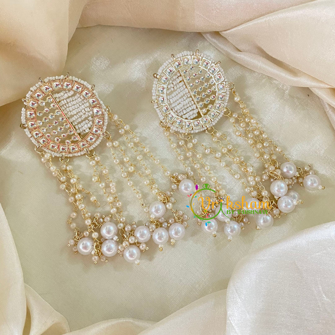 Pearl Designer Kundan Danglers with white kundan stone studded earrings; pearl or bead finish; party ewear earrings.