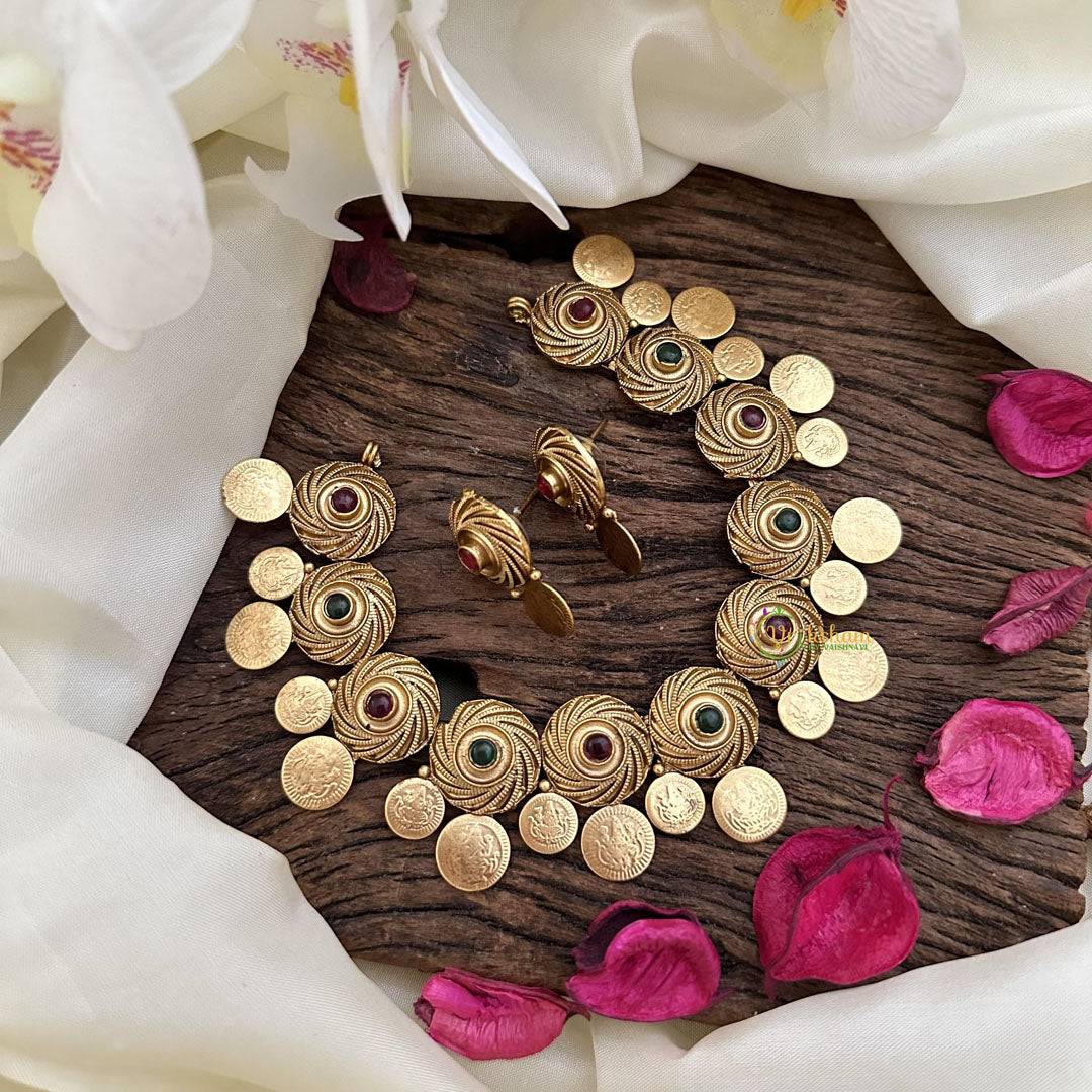 Indulge in luxury with our exquisitely crafted Designer Lakshmi Coin Short Neckpiece. Featuring intricate detailing and a beautiful Lakshmi coin pendant, this piece exudes sophistication and elegance. Elevate any outfit with this exclusive and timeless accessory.