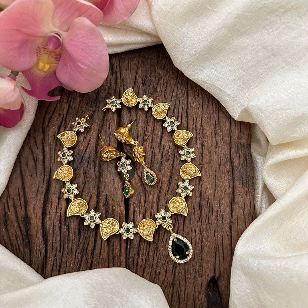 Introducing our Designer Lakshmi Short Neckpiece! Bold and elegant, this handcrafted piece showcases a green teardrop pendant inspired by traditional Indian jewelry. Feel empowered and confident wearing this unique statement necklace. Elevate your look with the Designer Lakshmi Short Neckpiece. Comes with matching earrings.