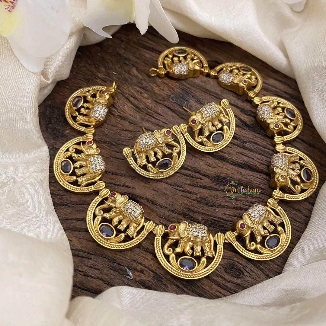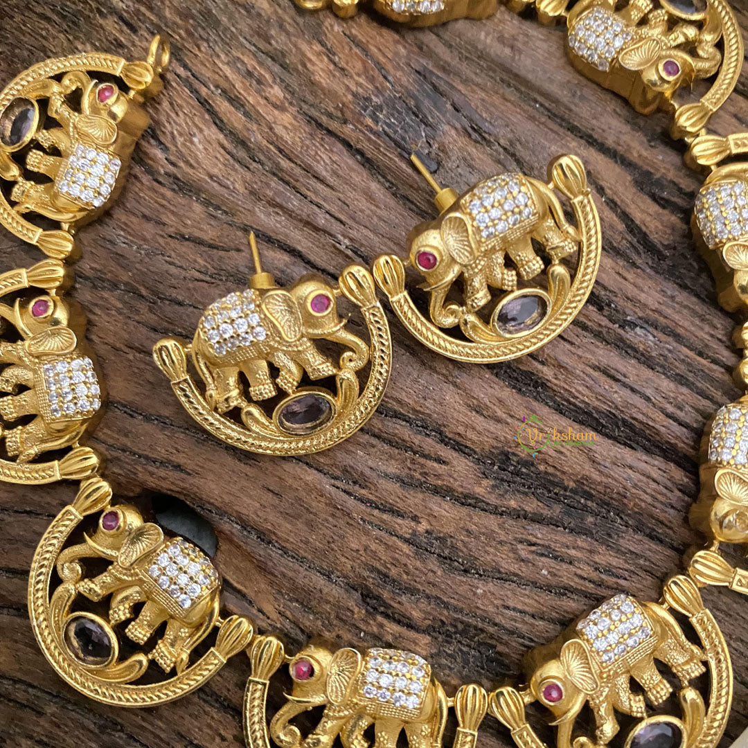 Indulge in timeless elegance with our Designer AD Stone Elephant Neckpiece. Crafted with intricate designs and adorned with sparkling AD stones, this neckpiece will add a touch of luxury to any outfit. The perfect balance of sophistication and style, it is a must-have for any fashion-forward individual. Elevate your look with this exclusive piece.