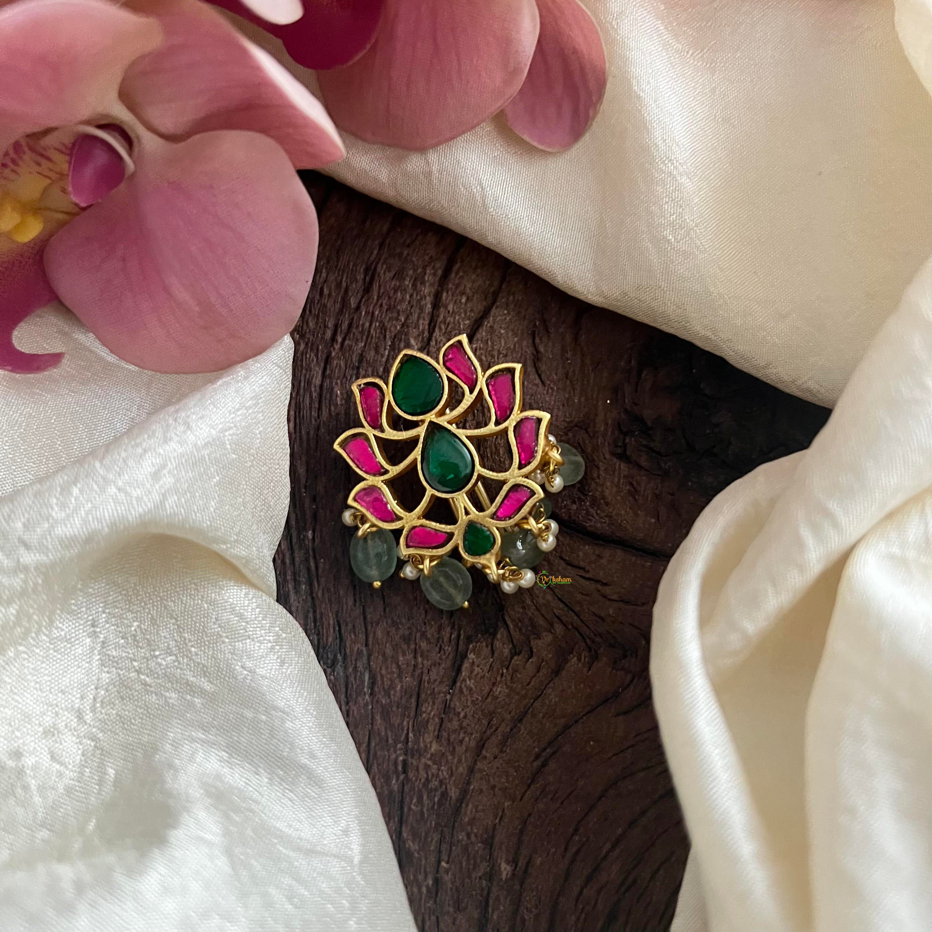 Designer Lotus Jadau Juda Pin-Pearl-Aqua Green Beads-G13940