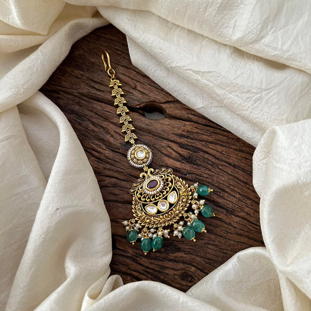 Elevate your style with our Designer Maang Tikka featuring elegant green beads and lustrous pearls. This exquisite piece seamlessly combines traditional and modern elements, making it a timeless addition to your jewelry collection. Perfect for special occasions, this maang tikka will add a touch of sophistication and grace to your look.
