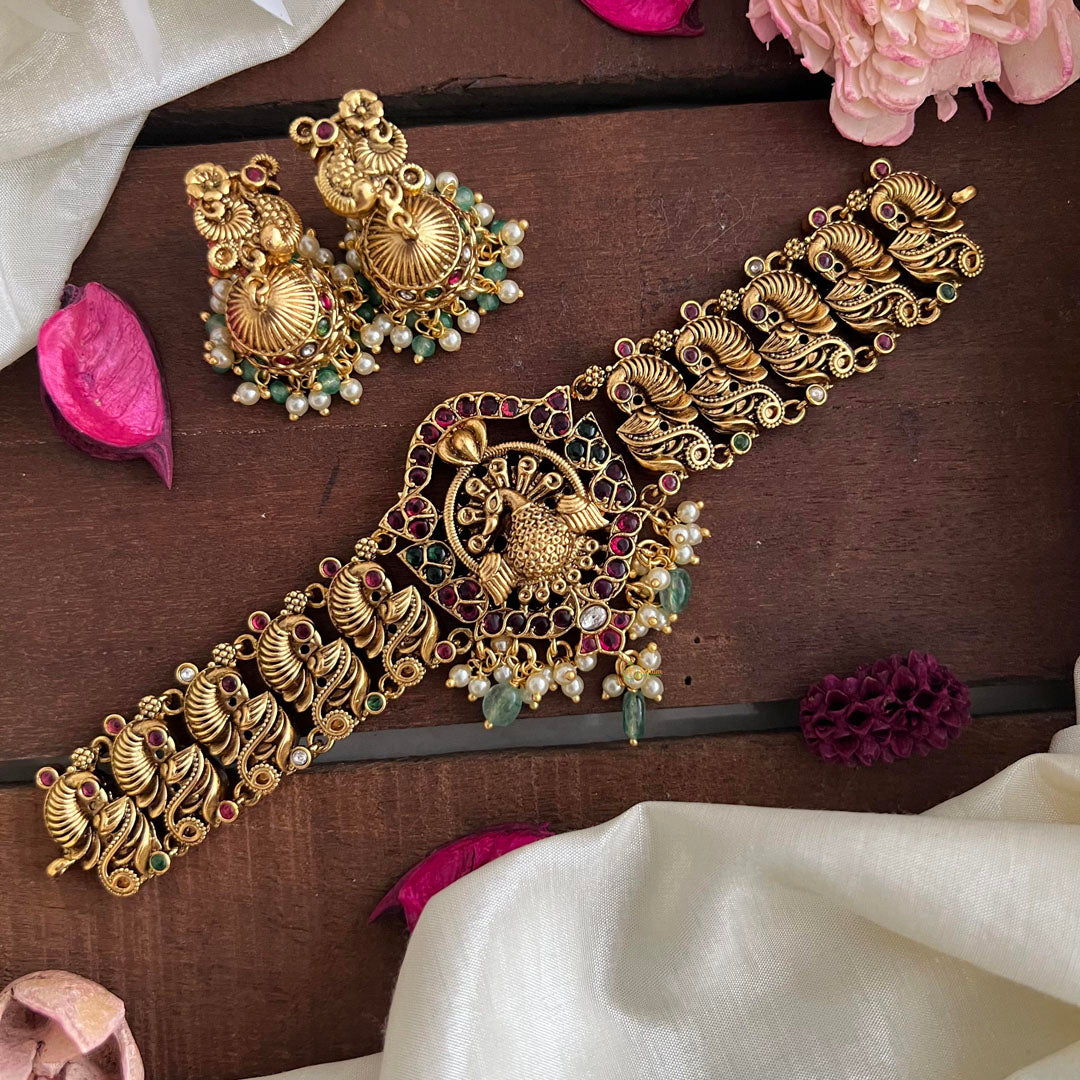 Elevate your style with our Designer Peacock High Neck Choker. Crafted with exquisite aqua green beads and pearls, this statement piece exudes elegance and sophistication. Inspired by the majestic peacock, it is the perfect accessory to add a touch of luxury to any outfit.