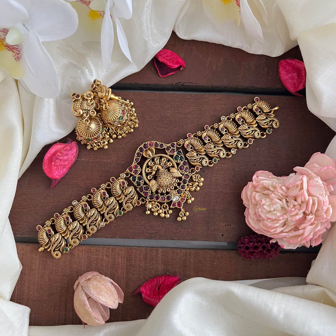 Introducing our Designer Peacock High Neck Choker, adorned with delicate gold beads. This luxurious piece showcases the intricate beauty of a peacock, elevating any outfit with its elegant and exclusive design. Perfect for those who appreciate the finer things in life.