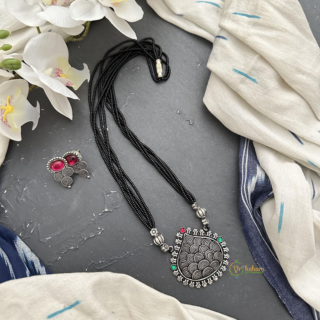 Elevate your style with this exclusive designer pendant. Crafted with a sleek black bead and short chain, this statement piece comes with matching earrings for a complete look. Make a sophisticated statement with this elegant set.