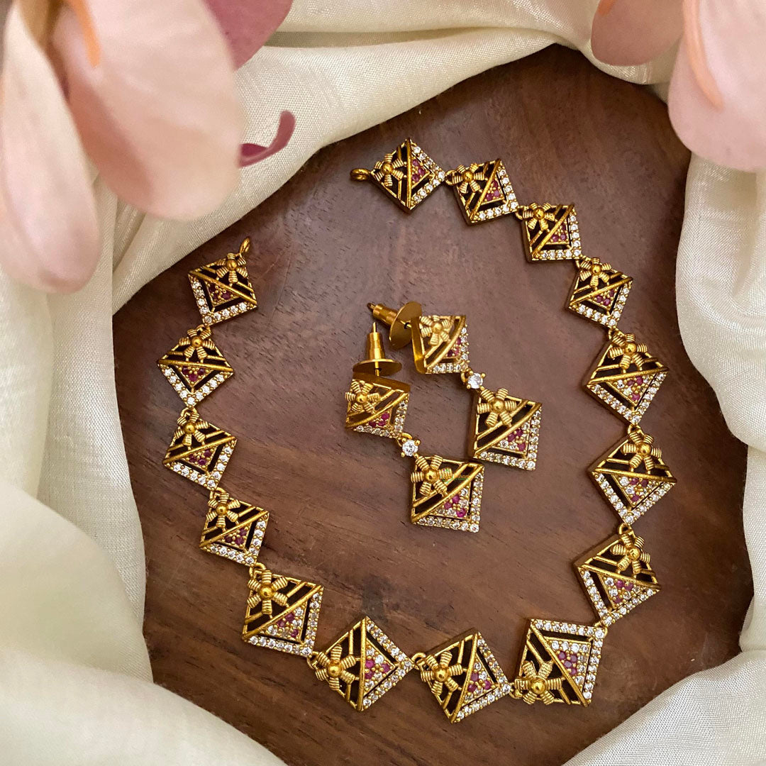 Elevate your style with our Designer AD Stone Short Neckpiece and matching earrings. Made with stunning diamonds, this set adds a touch of elegance to any outfit. Enhance your look with the beauty and sophistication of our exclusive design. Order now and make a statement!