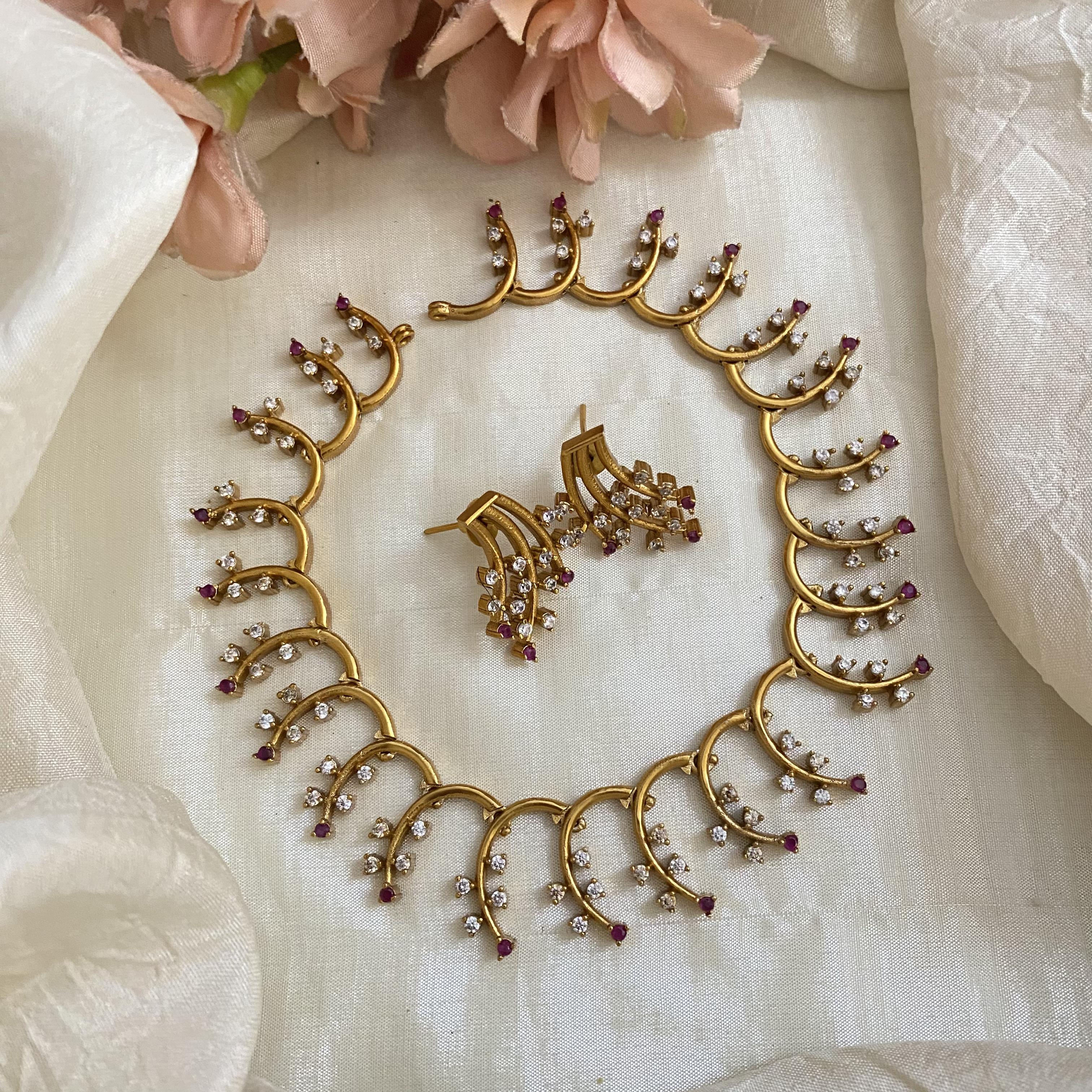 Designer Red White AD Stone Short Neckpiece- premium quality polish and imitation stones neckpiece, comes with matching earrings.