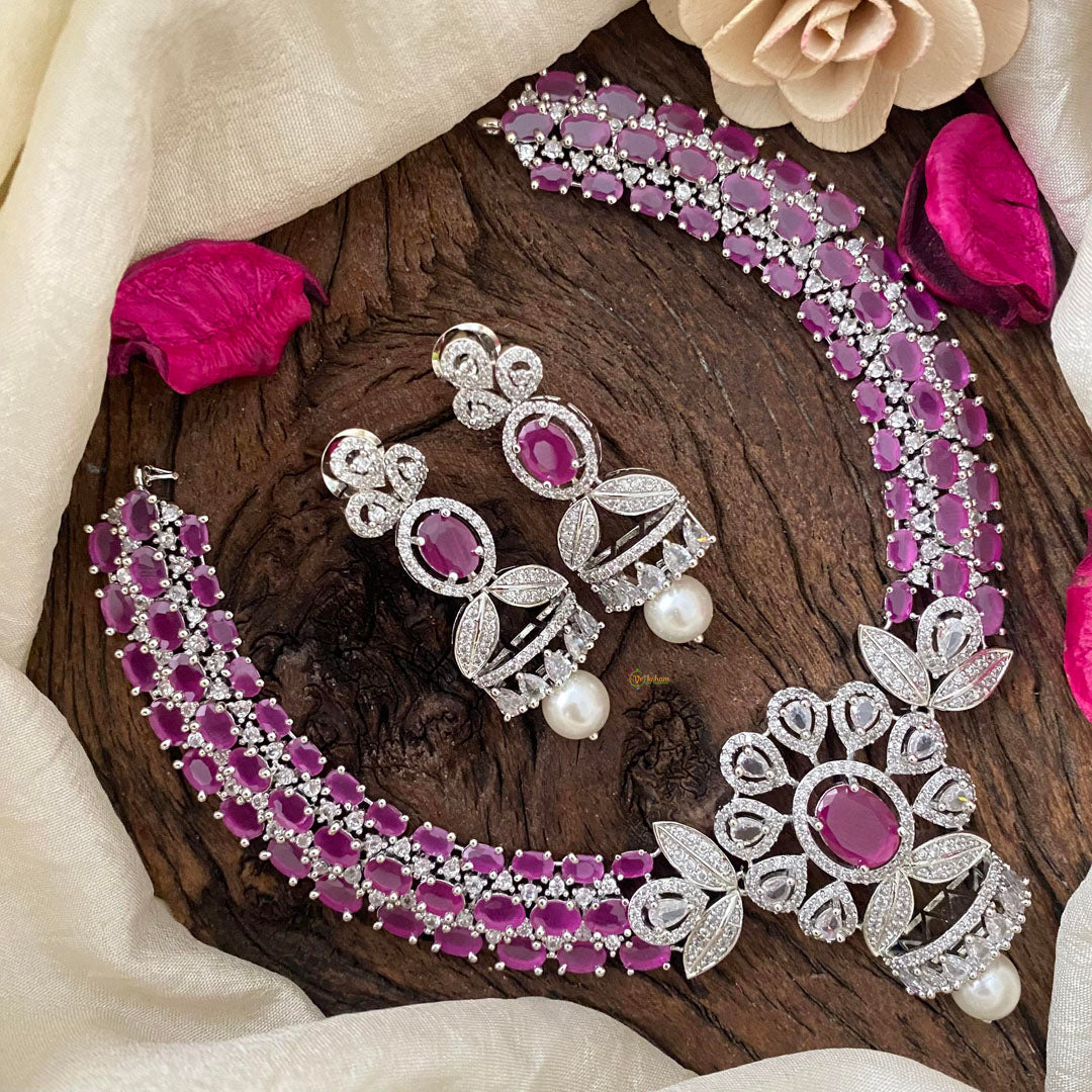 Elevate any outfit with our Designer Red White American Diamond Short Neckpiece, featuring elegant red and white jewels that bring a touch of luxury to your look. Made with high-quality materials, this designer neckpiece is a must-have accessory for any fashion-forward individual. Make a statement with this stunning piece. Comes with matching stone ear hangings.