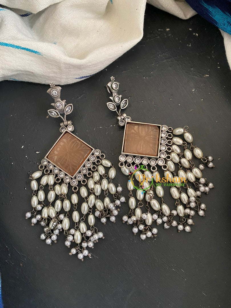 Designer Silver Look Alike Earrings -Brown stone set Silver Look Alike earrings with pearl hangings