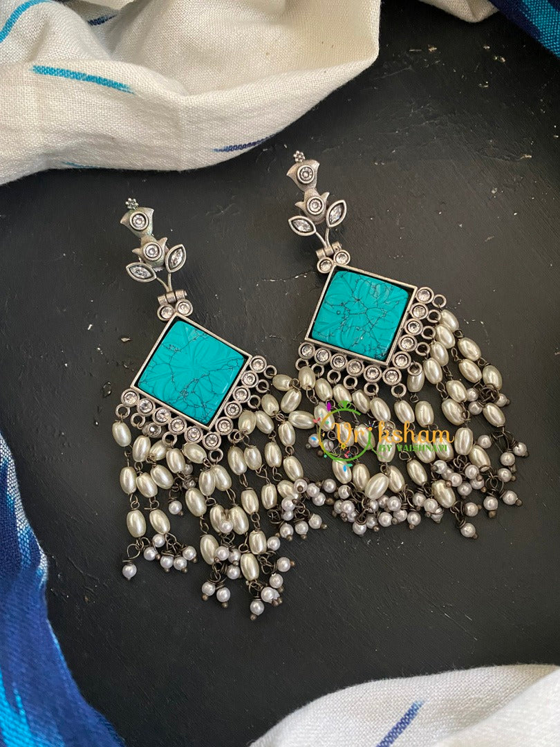 Designer Silver Look Alike Earrings -Turquoise Blue stone set Silver Look Alike earrings with pearl hangings