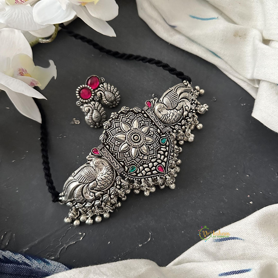 Indulge in luxurious elegance with our Designer Silver Polish Floral Dual Peacock Choker. The intricate floral design and dual peacock pendant exude sophistication, while the matching earrings complete the look. Elevate your style and make a statement with this exquisite choker.