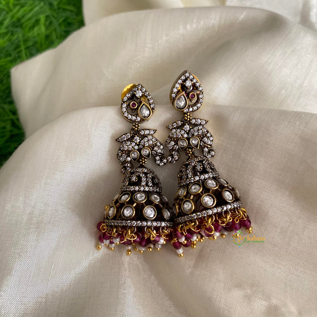 Designer Victorian Diamond Jhumkas-White Purple Pearls-VV1282