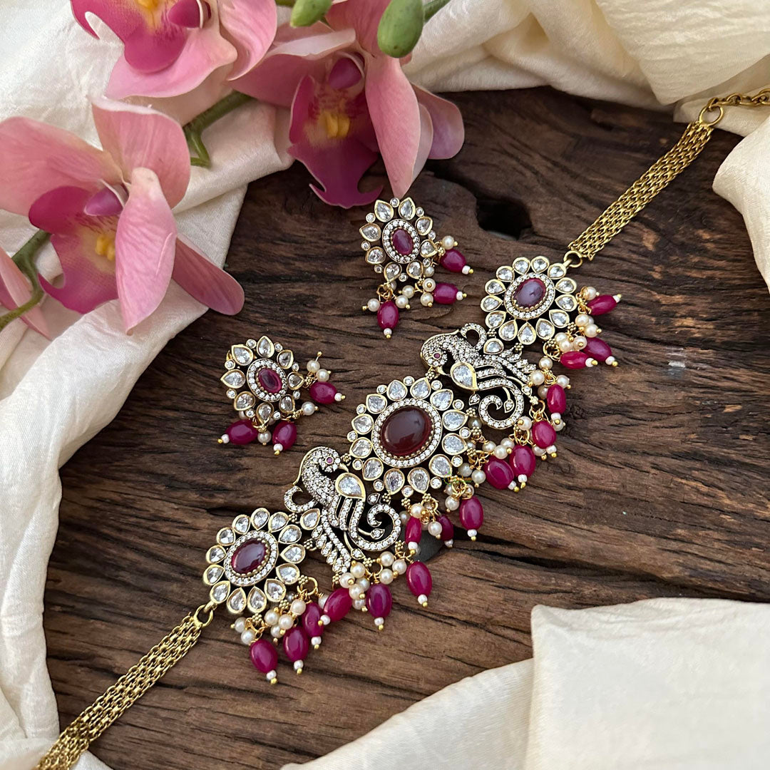Designer Victorian Diamond Mayil with Flower Choker- Red Beads-VV1639