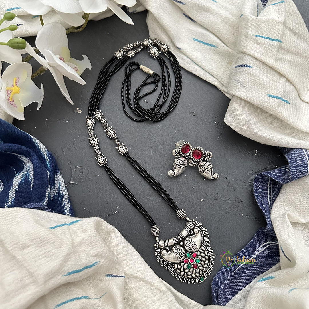 Add a touch of elegance to your look with our Dual Manga Pendant Black Bead Chain Neckpiece. The intricate design and black bead chain exudes sophistication, perfect for a night out or a special occasion. Complete the set with the matching earrings included. Elevate your style with this exclusive neckpiece.