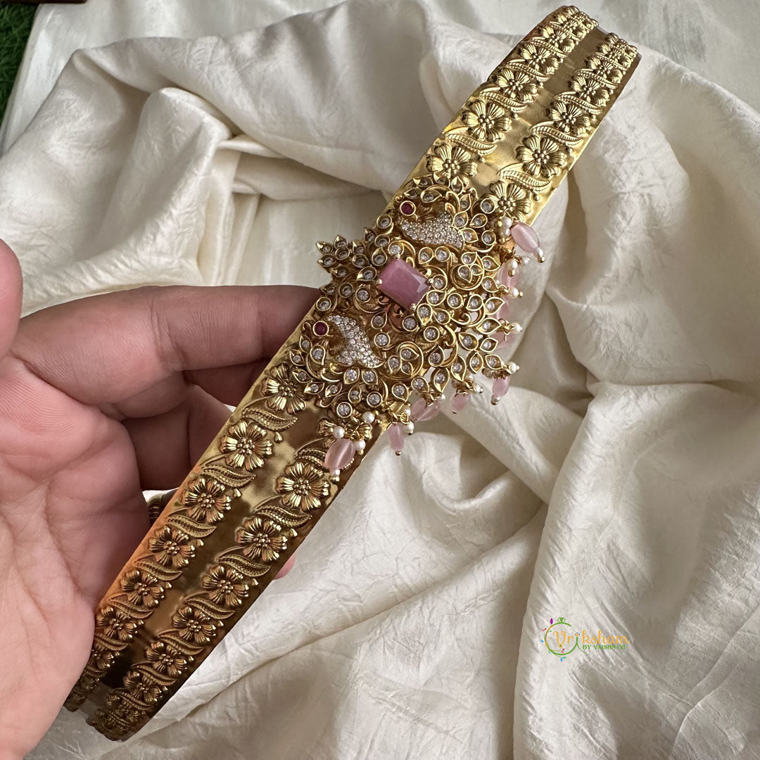 Dual Peacock AD Stone Pendant Plain Hipbelt - Gold Bead Pearl - Baby Pink- Gold Look alike Hipbelt with imitation stone embossed plain hipbelt.