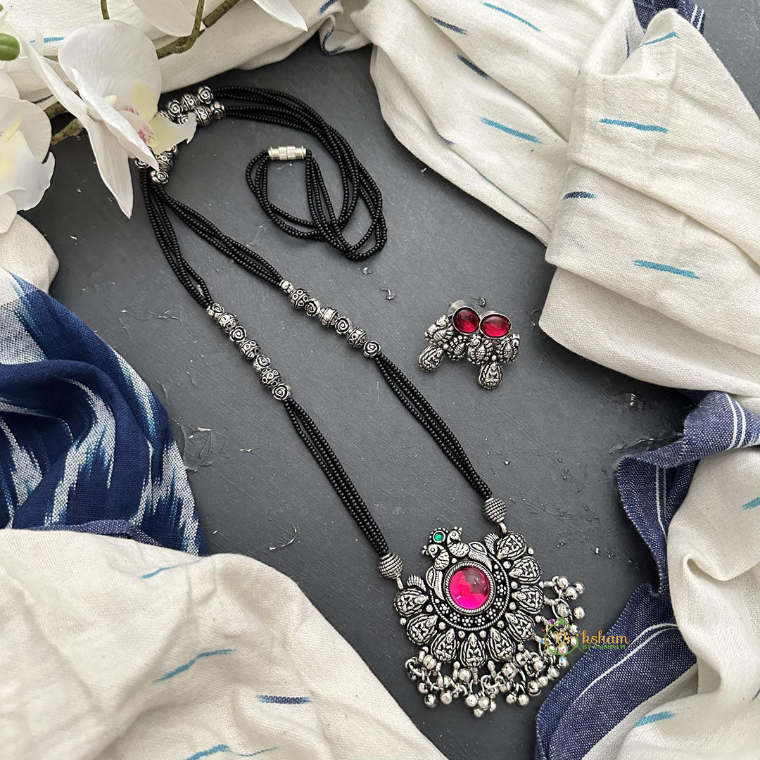 Indulge in luxury with our Dual Peacock Lakshmi Pendant Neckpiece. Featuring a black bead chain and matching earrings, this piece exudes elegance and sophistication. The dual peacock design symbolizes beauty, prosperity, and good fortune, making it a perfect addition to any outfit. Elevate your style with this exclusive neckpiece.