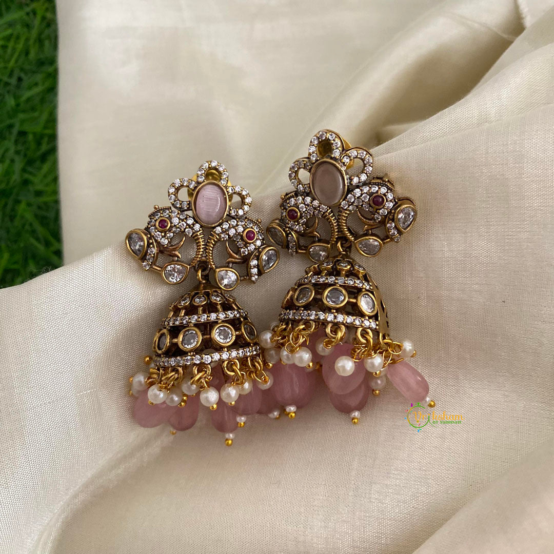 Dual Peacock Victorian Diamond Jhumkas-Pastel Pink-Pearls & Beads-VV1262