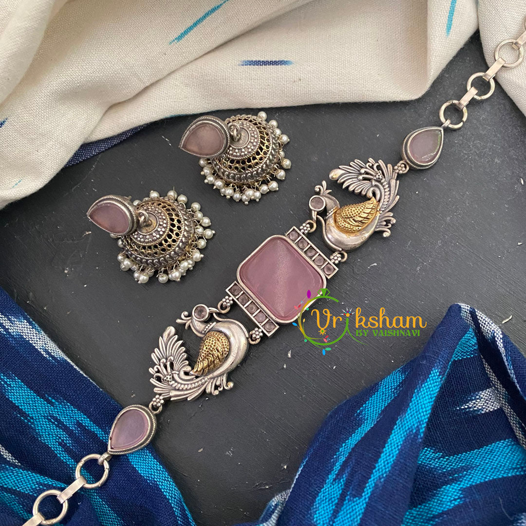 Pastel Pink Dual Tone High Neck Choker - stone studded square shaped with peacock on either side; comes with earrings with pearl finish.