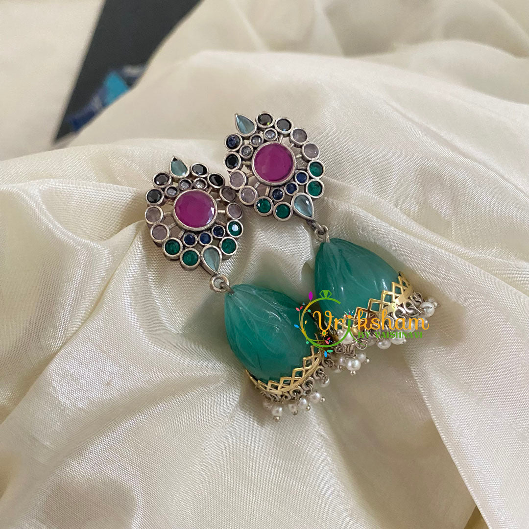 Dual Tone Jhumkas-Pink White Pastel Shades stoned studded flower stud and green stone bottom dual tone alike jhumkas.
