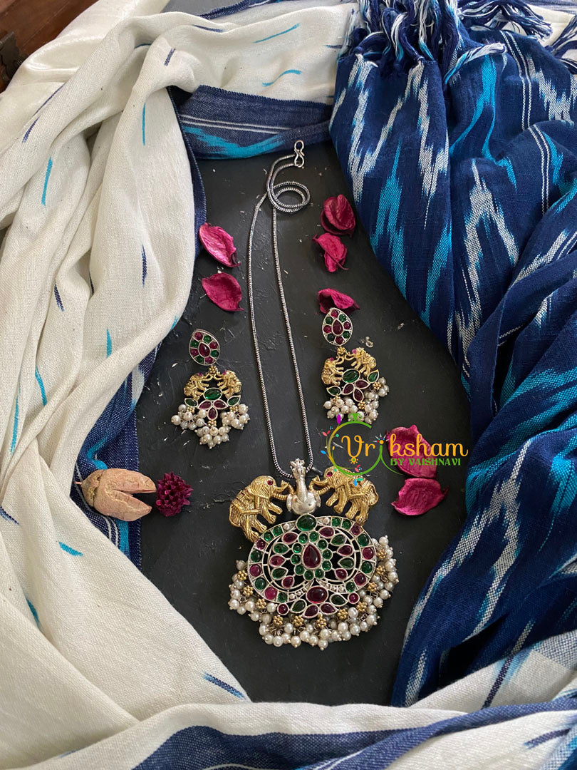 Dual Tone Pendant Chain Neckpiece– oxidized german silver and copper tone pendant and chain; comes with matching earrings.